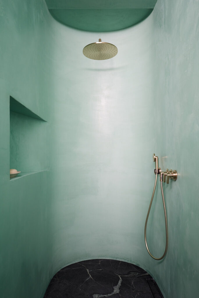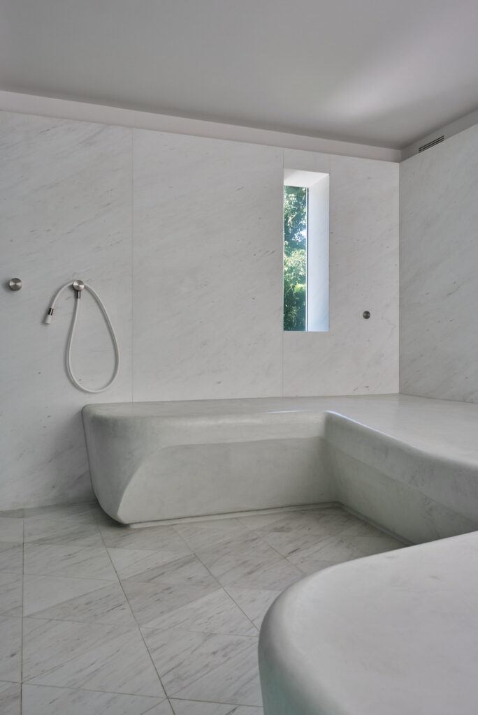 A concrete bench and shower hug one edge of the steam room.