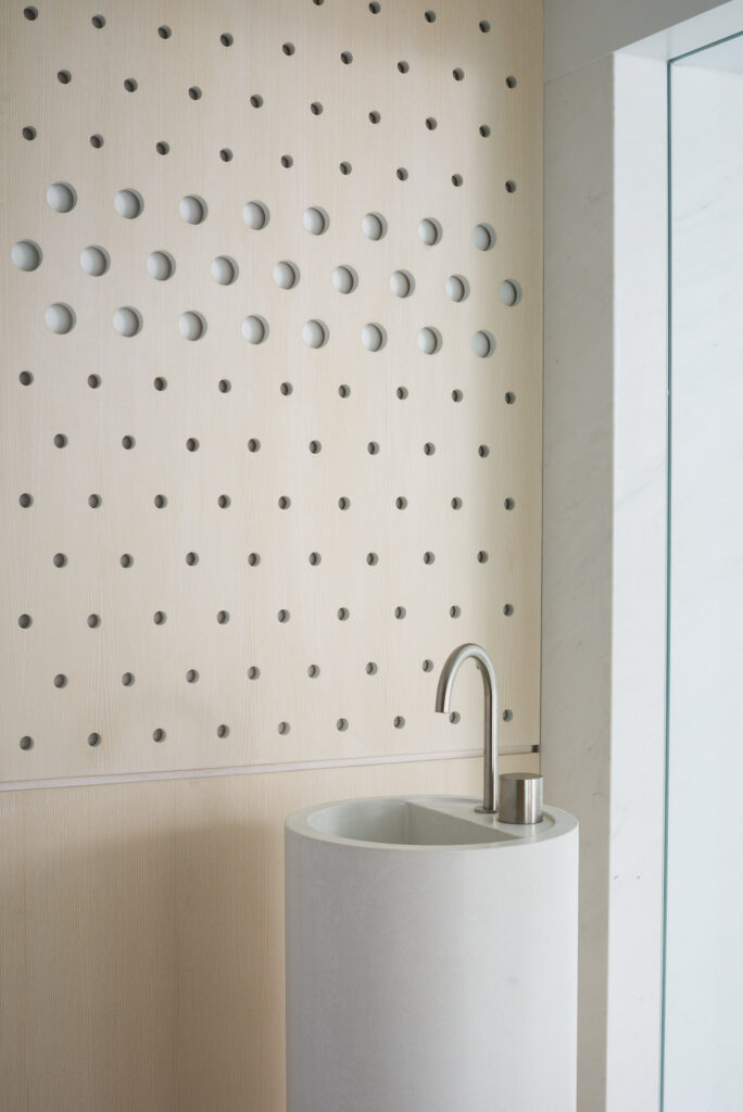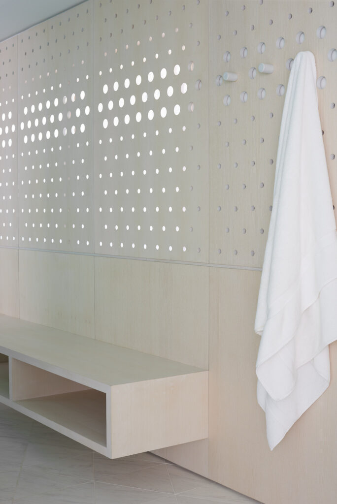 A screen limits views into the changing area but allows some dappled light. The larger holes at eye level preserve views from the inside to the outside without compromising the intimacy of the space.
