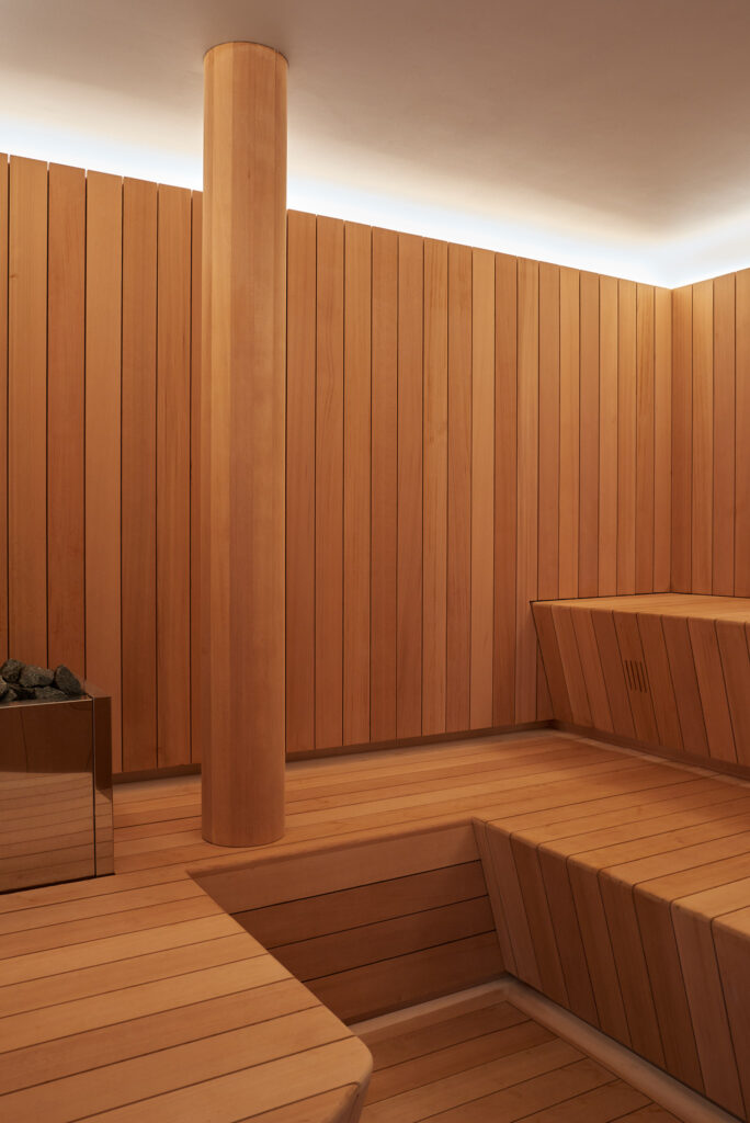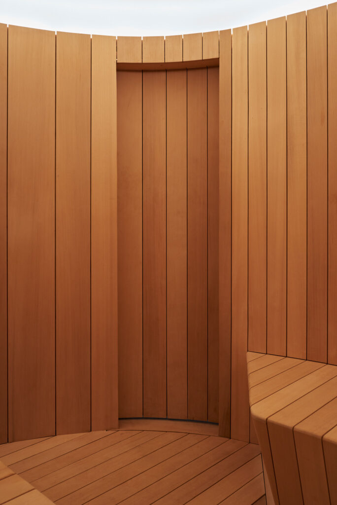 Cedar boards line the curved interior of the sauna.