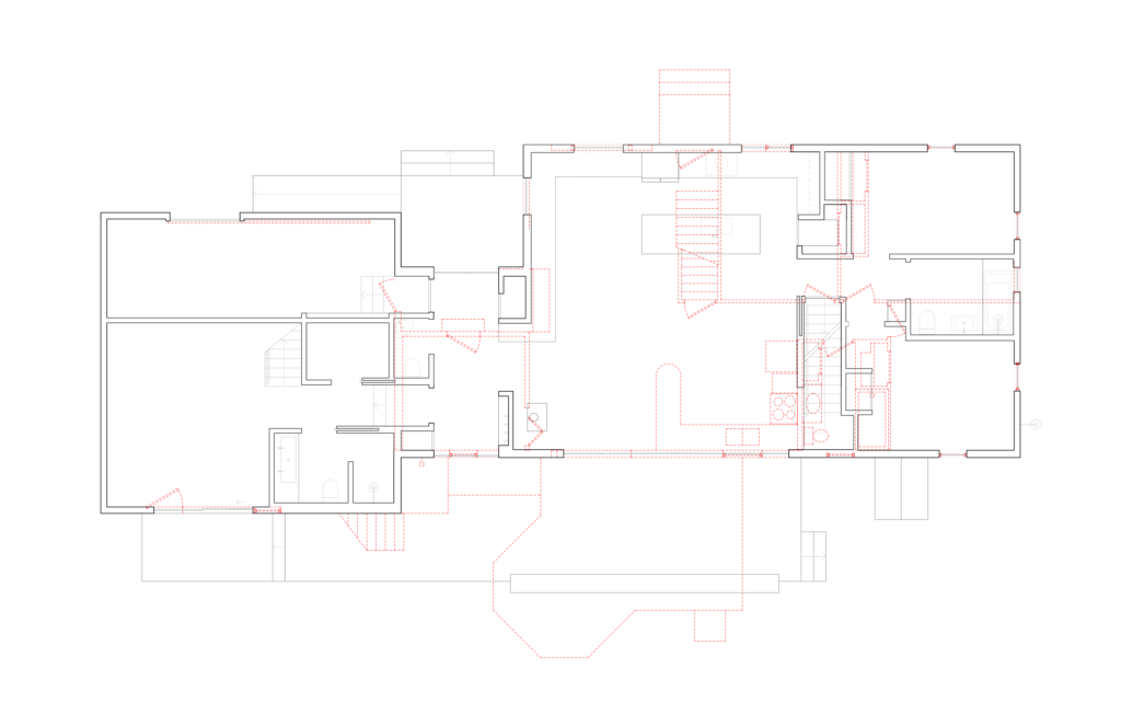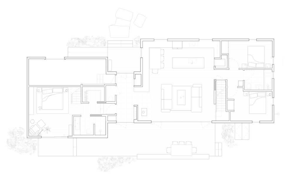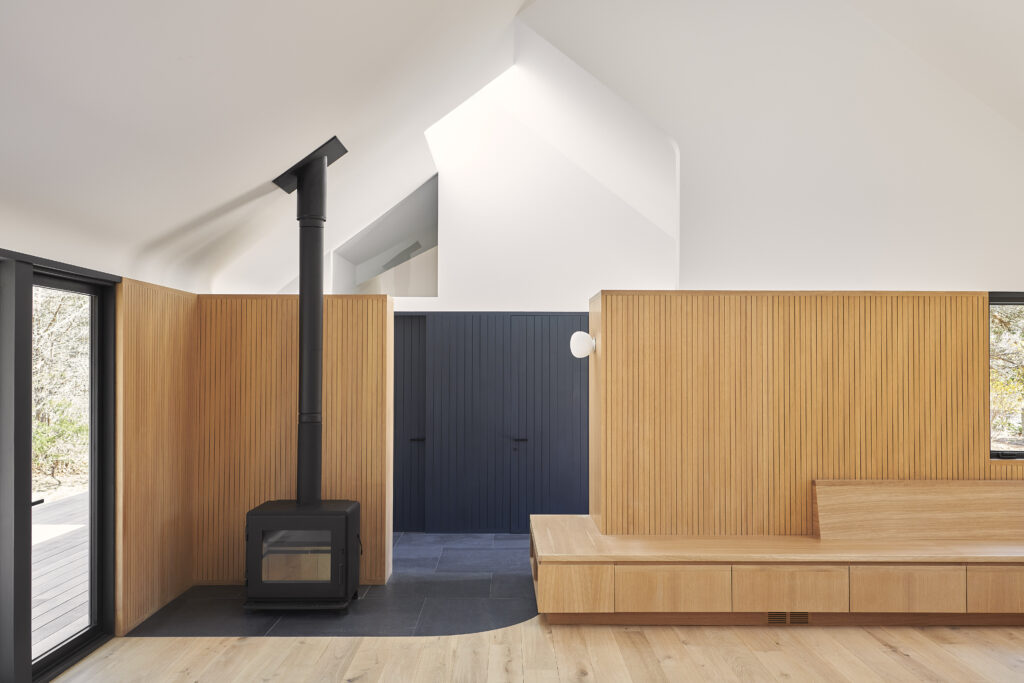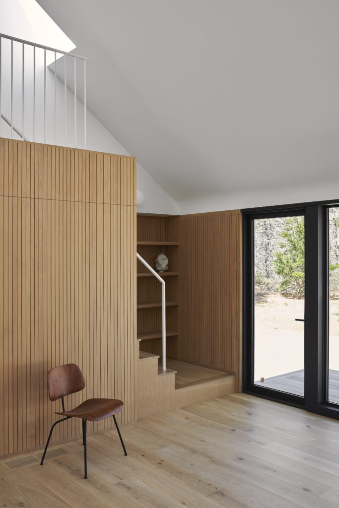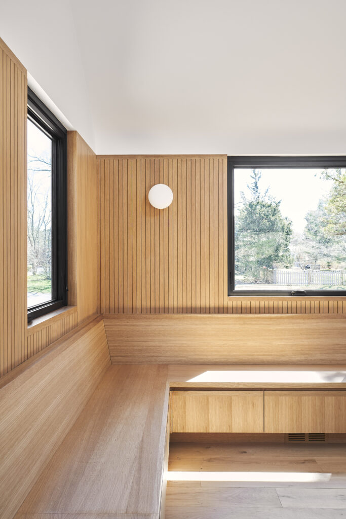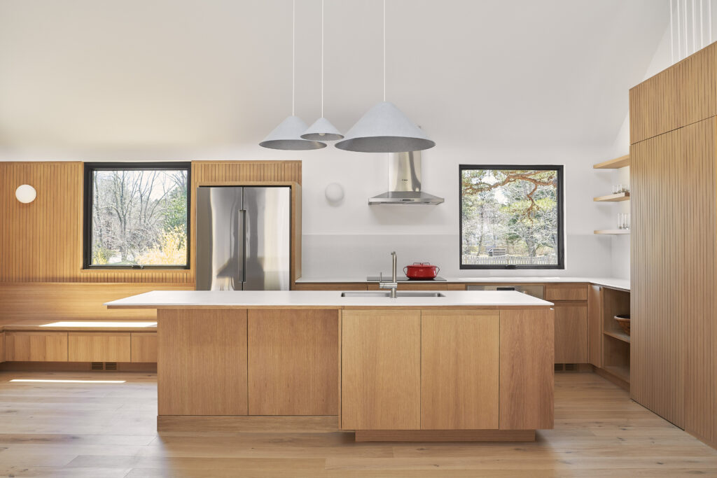 This renovation of a third-generation family home began with a modest house at the edge of a sensitive site, a short walk to the bay and adjacent to a wilderness preserve. In addition to the home, the original structure included a garage for wintering a boat which has now been incorporated into the house, maintaining the original footprint while adding living space with very little modification to the wood framing. The intersection of the simple roof lines between the garage and home is exposed at the new main entry, producing a geometry that extends in both directions to unify the ceiling from one end of the house to the other. Millwork storage walls and screens divide the home into discrete spaces, providing seating, while framing openings to the landscape.
