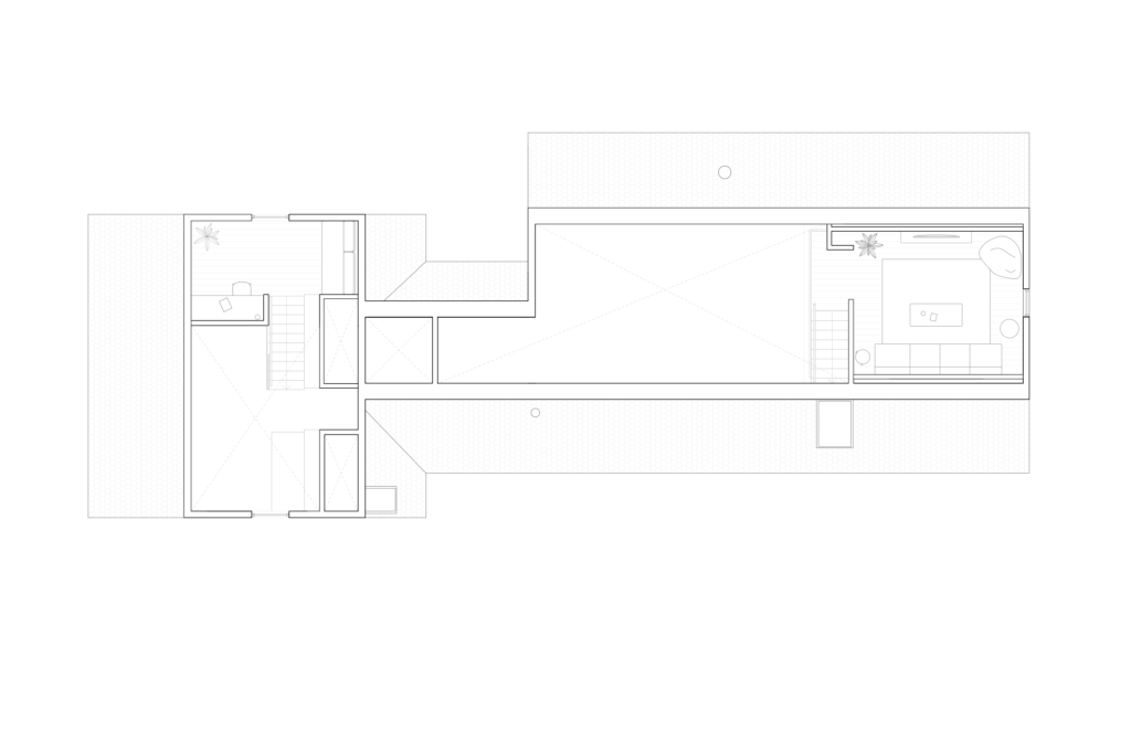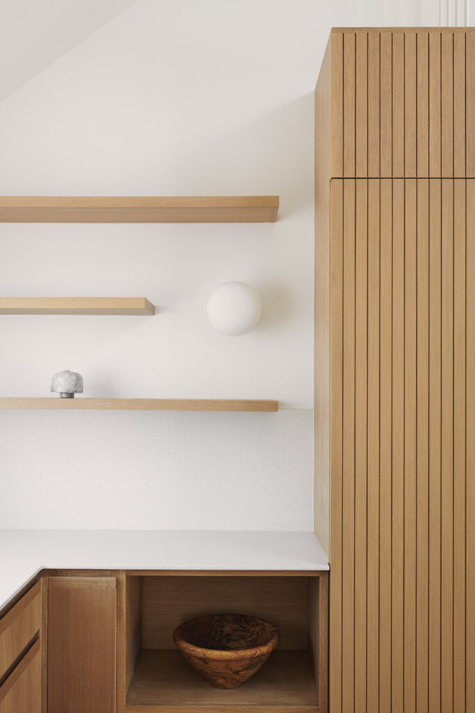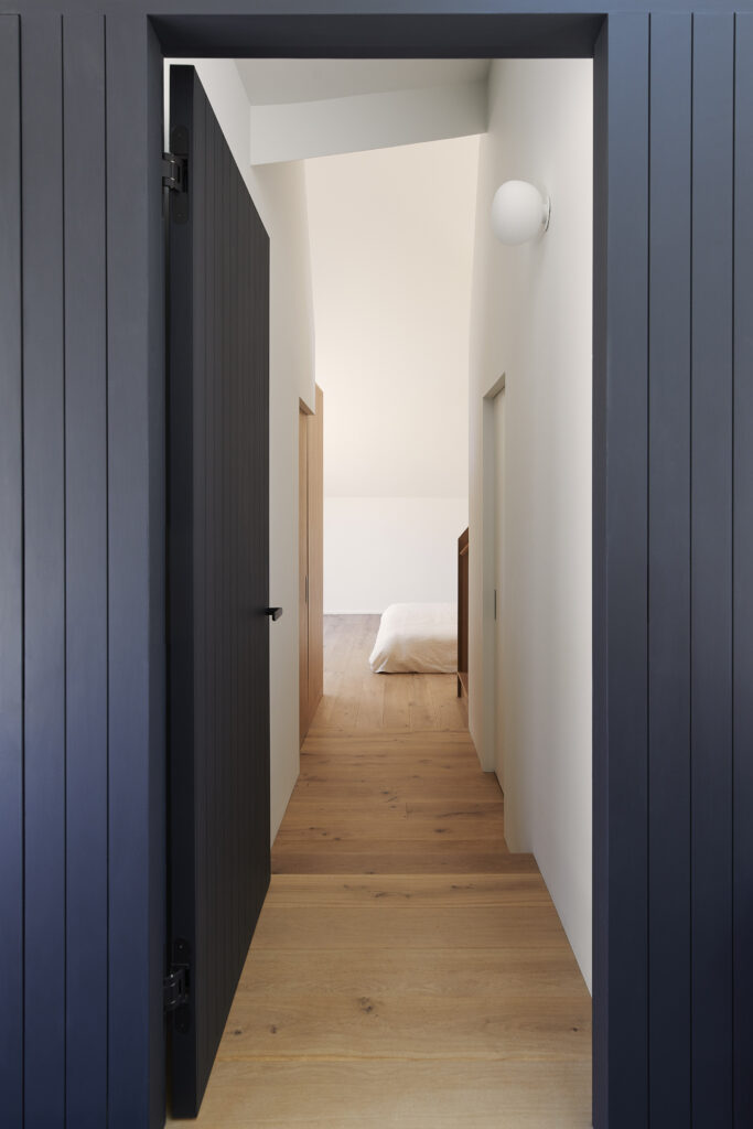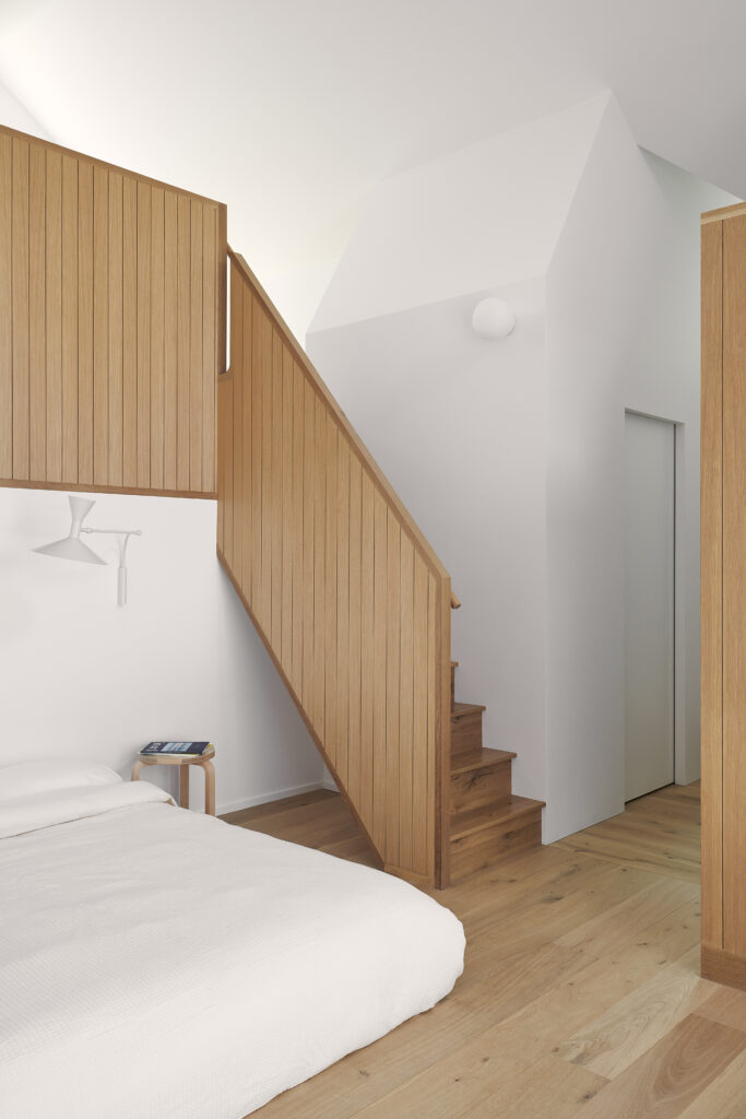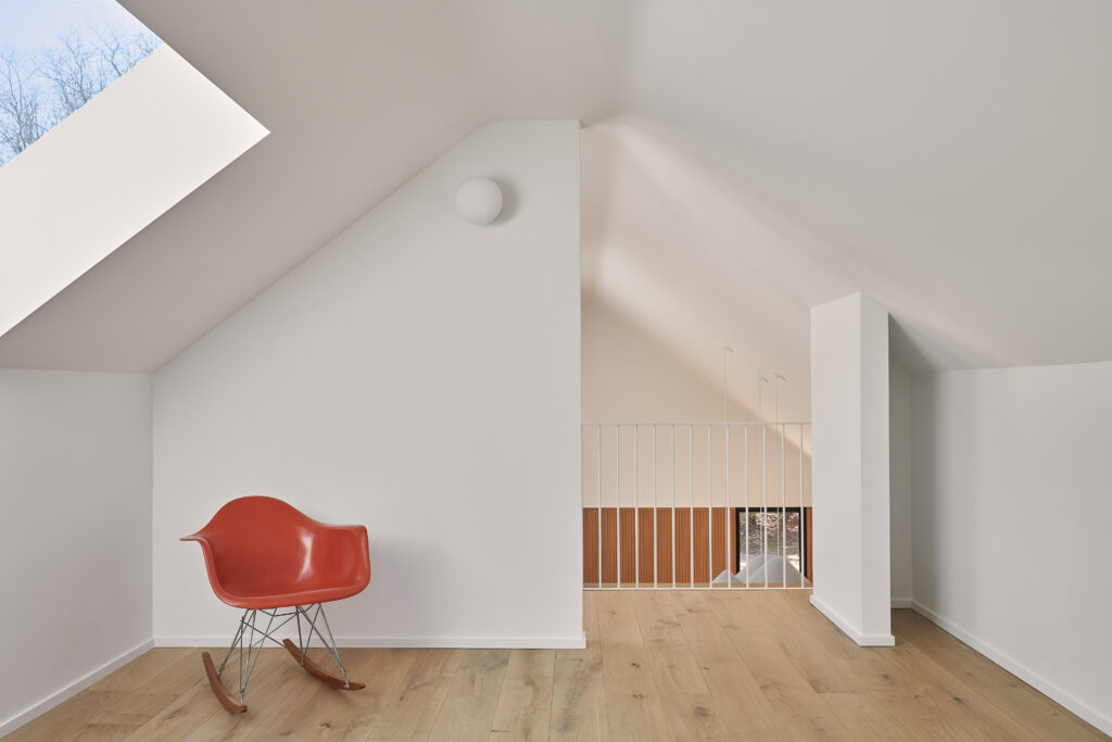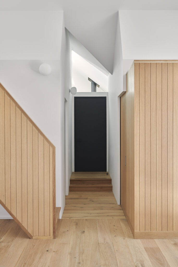 This renovation of a third-generation family home began with a modest house at the edge of a sensitive site, a short walk to the bay and adjacent to a wilderness preserve. In addition to the home, the original structure included a garage for wintering a boat which has now been incorporated into the house, maintaining the original footprint while adding living space with very little modification to the wood framing. The intersection of the simple roof lines between the garage and home is exposed at the new main entry, producing a geometry that extends in both directions to unify the ceiling from one end of the house to the other. Millwork storage walls and screens divide the home into discrete spaces, providing seating, while framing openings to the landscape.
