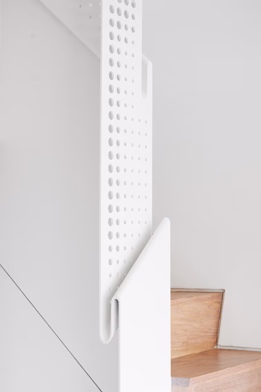 The Drape Stair is an architectural centerpiece constructed from three metal sheets suspended from the ceiling. Each sheet is artfully draped to achieve structural integrity while functioning as a handrail. At the corners, the sheets interlock like puzzle pieces, creating a seamless, continuous enclosure. This project embodies elegance and innovation, blending sculptural design with functional purpose.